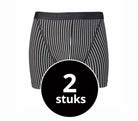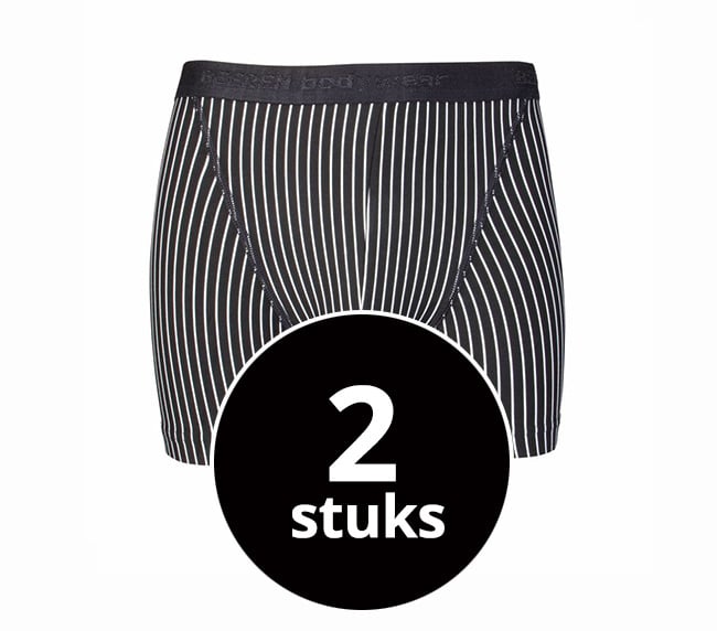Twee elastische gestreepte boxershorts, gemaakt van zachte micro stof. De pijpen zijn omgezoomd, en de taille is afgezet met een zwarte tekstband met de tekst Beeren Bodywear ingeweven.