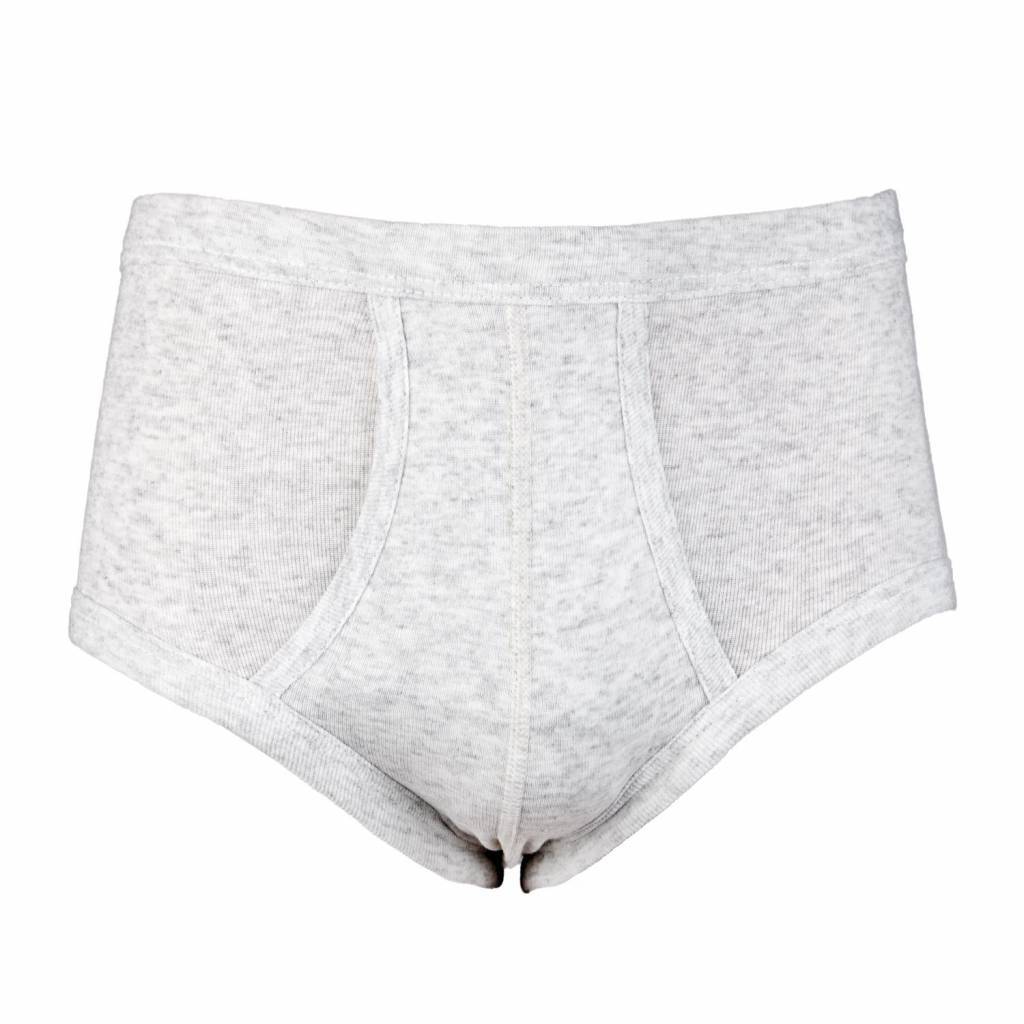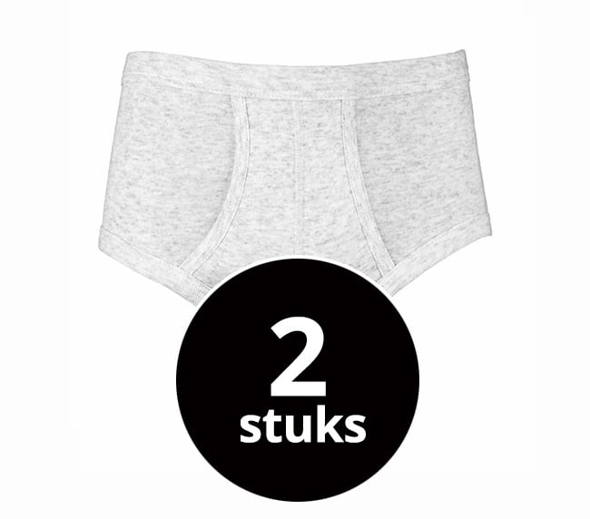 Twee klassieke heren slips met gulp. De stof is gemeleerd. Zowel de pijpen als de taille zijn afgezet met boord met daarin elastiek.