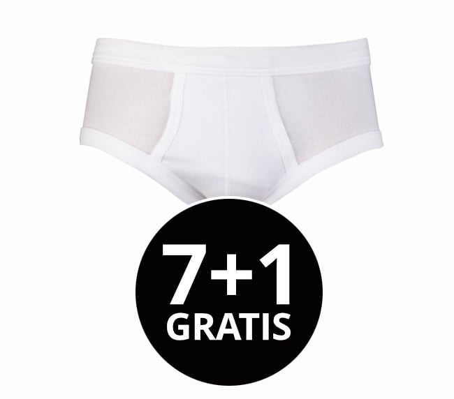 8 slips voor de prijs van 7. Klassieke heren slips met gulp gemaakt van een elastische fijnrib. Zowel de pijpen als de taille zijn afgezet met boord met daarin een elastiek.