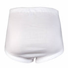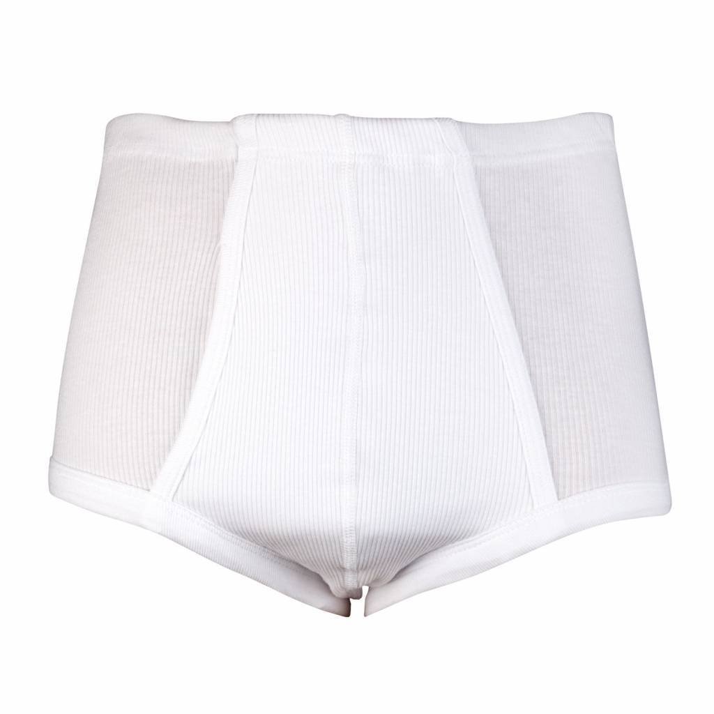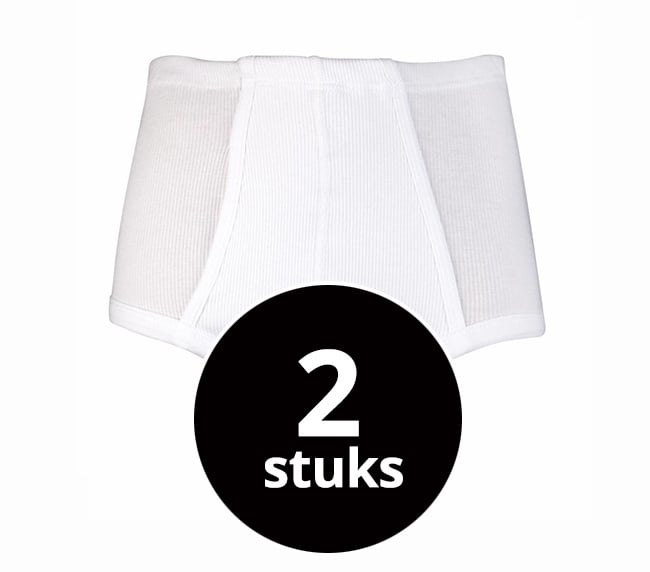 Twee heren slips met gulp gemaakt van een rib stof. Deze slip sluit vrij hoog in de taille. De taille van deze slip is omgezoomd met een tunnelelastiek. De pijpen zijn afgezet met boord.